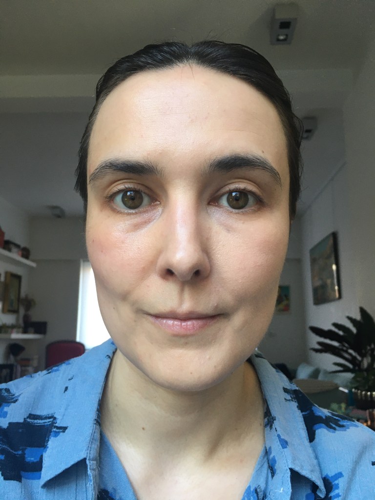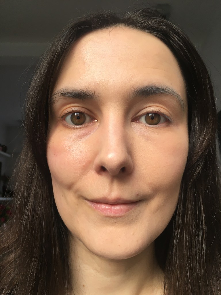 After a sunny al fresco lunch I spot a foundation imprint of my sunnies’ nose pads on my skin, so it does move around a bit. (It will stain a mouth mask a bit, too.) The formula emphasizes the dry spots on my skin slightly even though it feels nourishing.