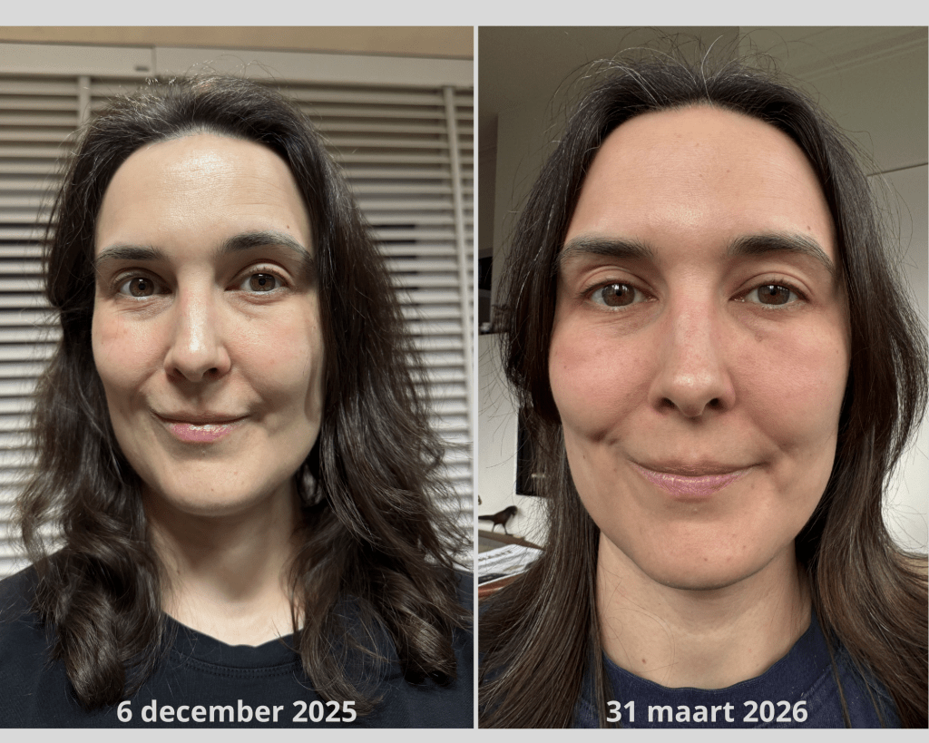 Hieronder vind je een foto van begin december en een recente foto. Ik vind dat vooral de rimpel rechtsonderaan (op de foto) minder diep oogt. (Goed om weten: eigen foto’s zijn moeilijk om te vergelijken. Ik maak geen deel uit van een professioneel klinisch onderzoek met professionele apparatuur. Deze foto’s zijn niet in hetzelfde licht, niet op dezelfde plek, wel met dezelfde camera genomen.)